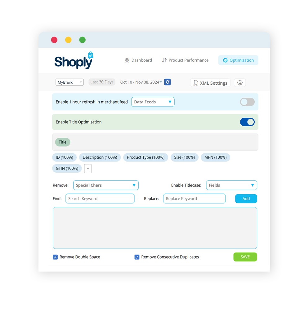 Refine your product titles in bulk to include relevant keywords and attributes, increasing impressions and CTR on Google Shopping placements. The process is quick and simple, allowing you to create a supplementary feed within minutes and upload it to your Google Merchant Center.